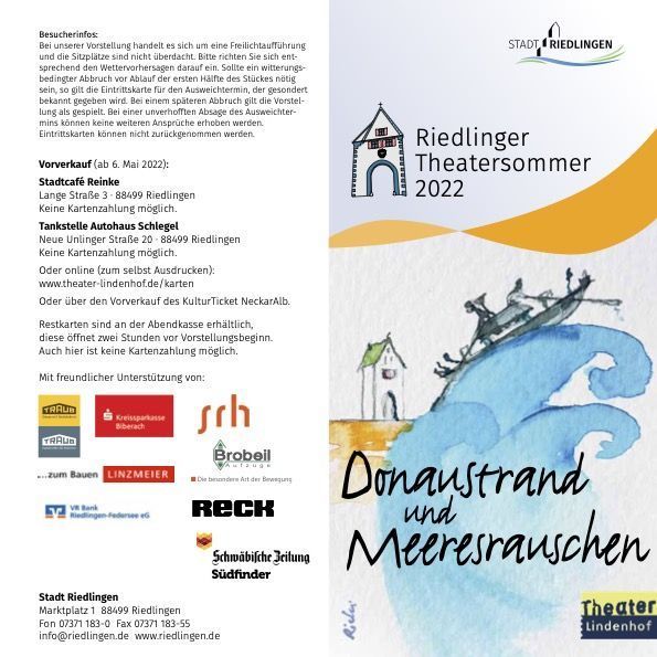 Direkt am Donauufer in Riedlingen findet vom 29. Juni bis 9. Juli der Riedlinger Theatersommer mit dem Stück „Donaustrand und Meeresrauschen“ statt. Der Riedlinger Theatersommer ist eine Veranstaltung der Stadt Riedlingen in Kooperation mit dem Theater Lindenhof und Bürger*innen aus Riedlingen und Umgebung.