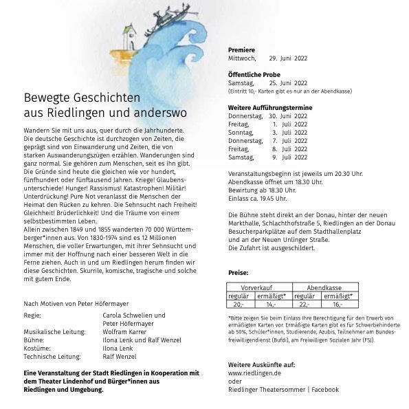 Im Frühjahr 2020 mussten die bereits begonnenen Planungen und Proben für einen Theatersommer aufgrund der Coronalage abrupt eingestellt werden. Mit voller Kraft haben sich die Theatermacher nun wieder ans Werk gemacht, die Segel zu setzen und das Schiff erneut auf die Reise zu schicken. Mit „Wandern Sie mit uns aus, quer durch die Jahrhunderte“, lädt das Theaterstück den Besucher ein. Die deutsche Geschichte ist durchzogen von Zeiten, die geprägt sind von Einwanderung und Zeiten, die von starken Auswanderungszügen erzählen. Wanderungen sind ganz normal. Sie gehören zum Menschen, seit es ihn gibt. Die Gründe sind heute die gleichen wie vor hundert, fünfhundert oder fünftausend Jahren. Kriege! Glaubensunterschiede! Hunger! Rassismus! Katastrophen! Militär! Unterdrückung! Pure Not veranlasst die Menschen der Heimat den Rücken zu kehren. Die Sehnsucht nach Freiheit! Gleichheit! Brüderlichkeit! Und die Träume von einem selbstbestimmten Leben. Allein zwischen 1849 und 1855 wanderten 70 000 Württemberger aus. Von 1830-1974 sind es 12 Millionen Menschen, die voller Erwartungen, mit ihrer Sehnsucht und immer mit der Hoffnung nach einer besseren Welt in die Ferne ziehen. Auch in und um Riedlingen herum finden wir diese Geschichten. Skurrile, komische, tragische und solche mit gutem Ende.